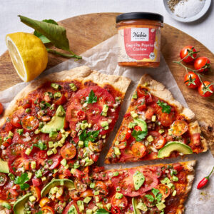 Pizza mal anders: Mit cremiger Avocodo, frischen Tomaten und unserem Paprika Cashew Aufstrich.