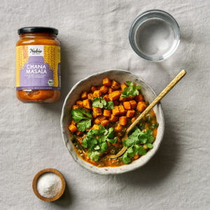 Süßkartoffeln, Spinat und Kichererbsen in einer cremigen Sauce – mehr braucht es nicht, um ein indisches Wohlgühlgericht zu zaubern
