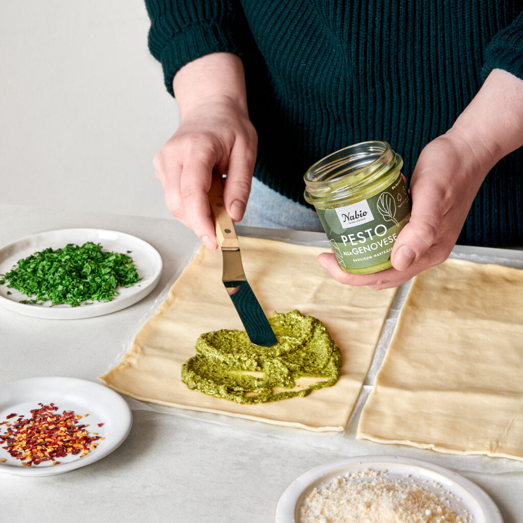 4. Die Hälften wieder voneinander trennen, eine Seite auf ein mit Backpapier belegtes Blech le- gen, mit Pesto bestreichen und den zweiten Teig anschließend wieder passend darauflegen.