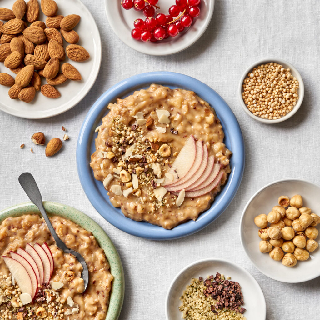 Knackige Nüsse, Hafer, Leinsamen und fruchtige Apfelstückchen – unsere Porridge Bowl ist ein perfekter Energielieferant – fertig vorbereitet im Glas. Leinsamen liefern wertvolle Ballaststoffe, Hafer sorgt für langanhaltende Energie und die Kombination aus cremiger Textur und nussigem Crunch macht jede Pause zum kleinen Genussmoment.